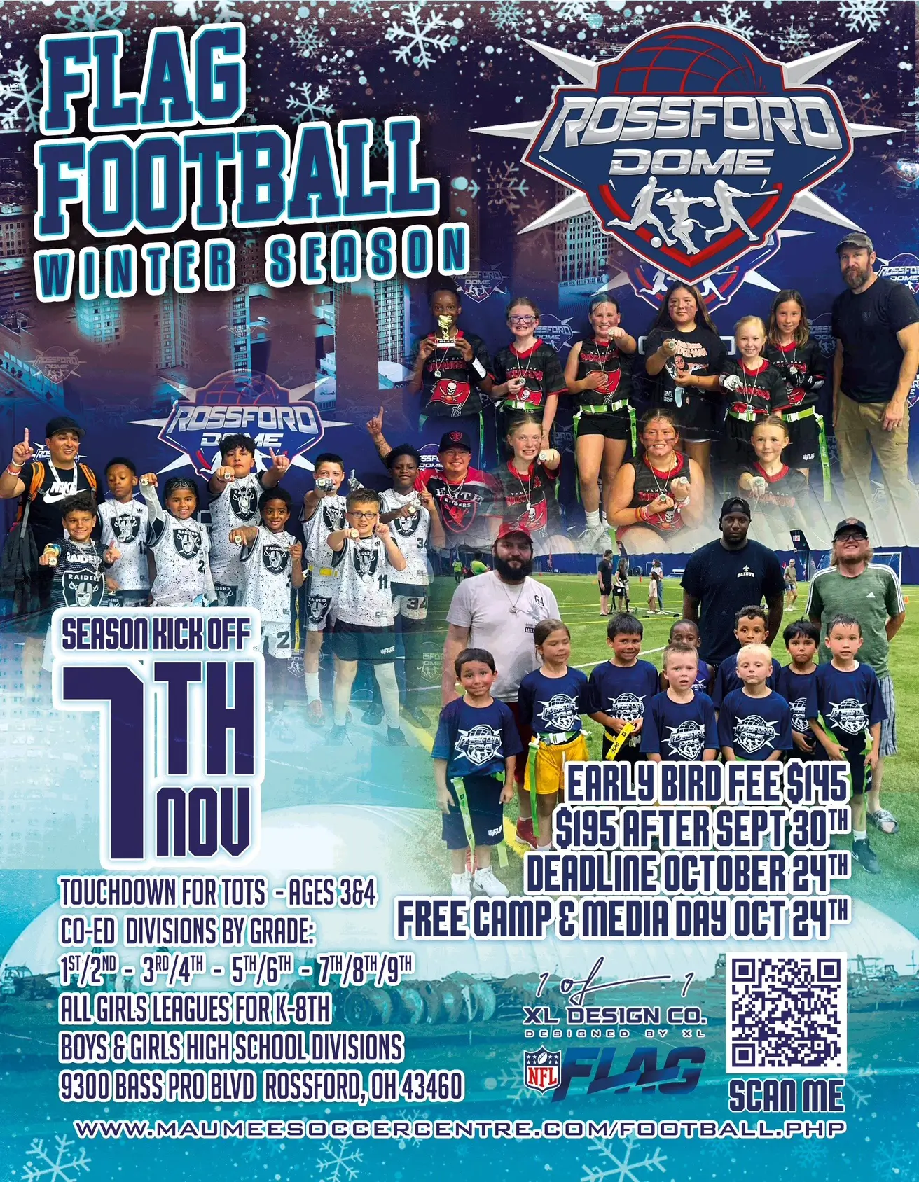Leagues forming now for Dome Flag Football! Come join the largest and most competitive Youth Flag Football program in Ohio. Register as a team or as an individual. Dome Flag Football offers leagues for grades Pre-K thru 8th grade all year. All games will be played at The Rossford Dome and Maumee Soccer Centre. Leagues will conclude with a playoff tournament and Super Bowl. Also, we have a Pro Bowl with selected players at the conclusion of the season. Each registration comes with a free camp during the season.